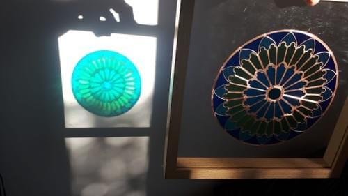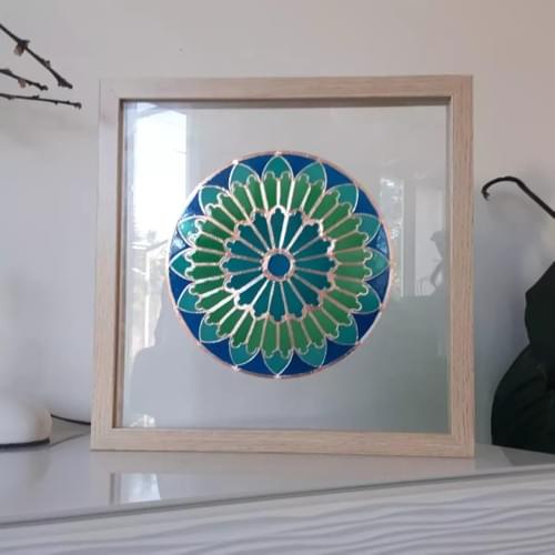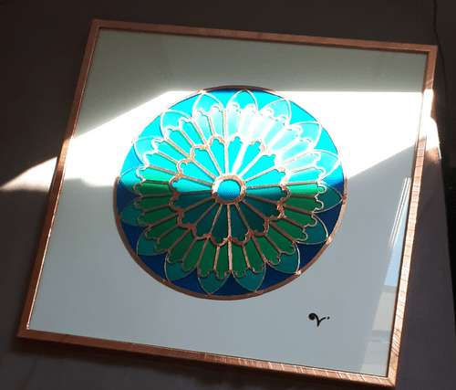 Peinture sur verre de 30x30cm, réalisée intégralement à la main. Cerne en cuivre ciselé. Ouvrage unique.