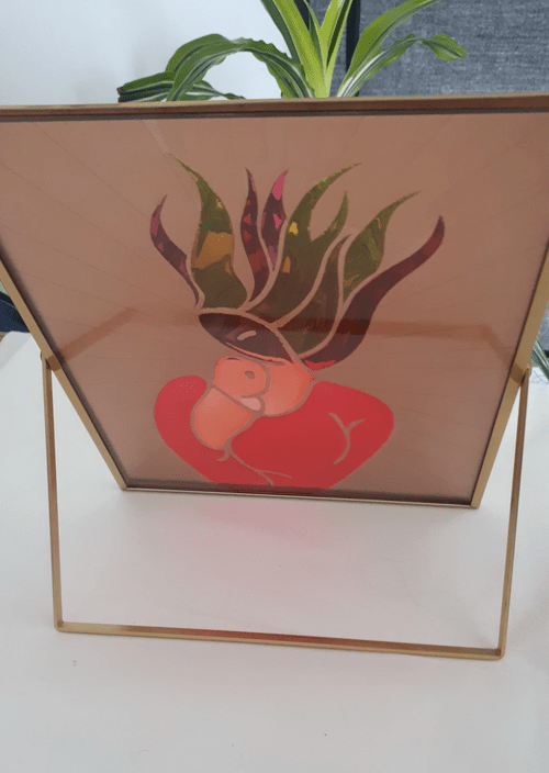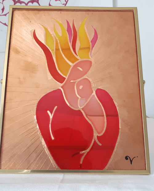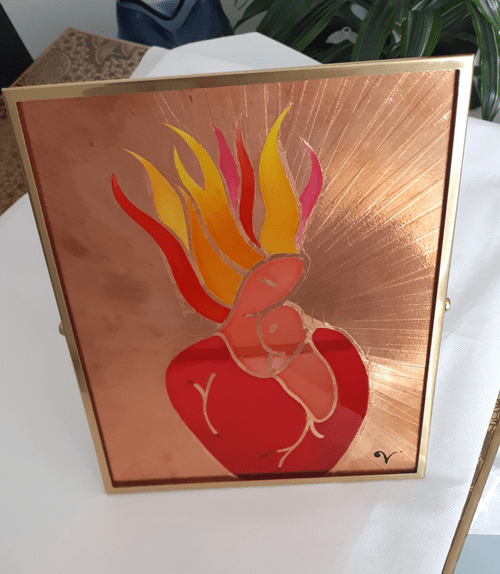 Peinture sur verre et cuivre ciselé, 20x25cm. Ouvrage unique.