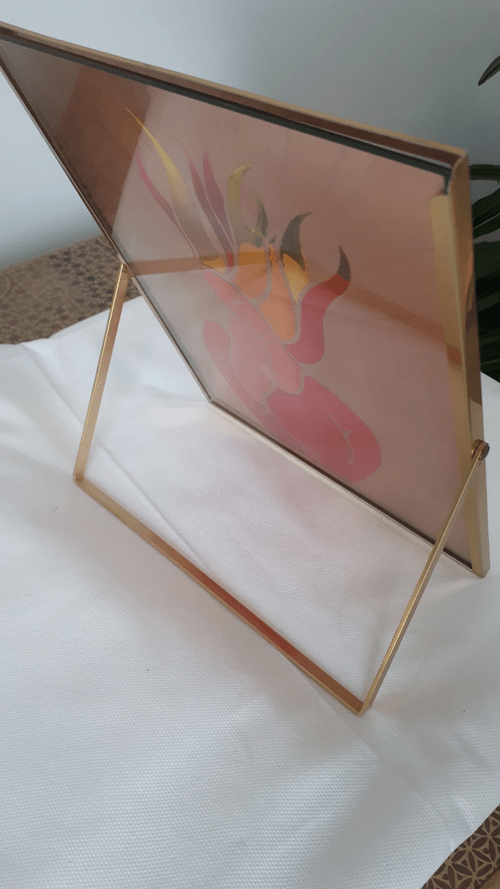 Cadre à poser en métal doré. Il présente deux verres, l'un peint, l'autre vierge, laissant la possibilité d'intercaler une image, une photo ou autres entre les deux.