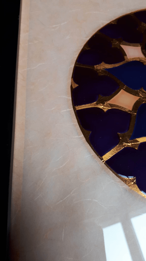 Peinture sur verre 30x30cm et cuivre ciselé. Encadrement avec double verre et passe-partout en papier murier rose.